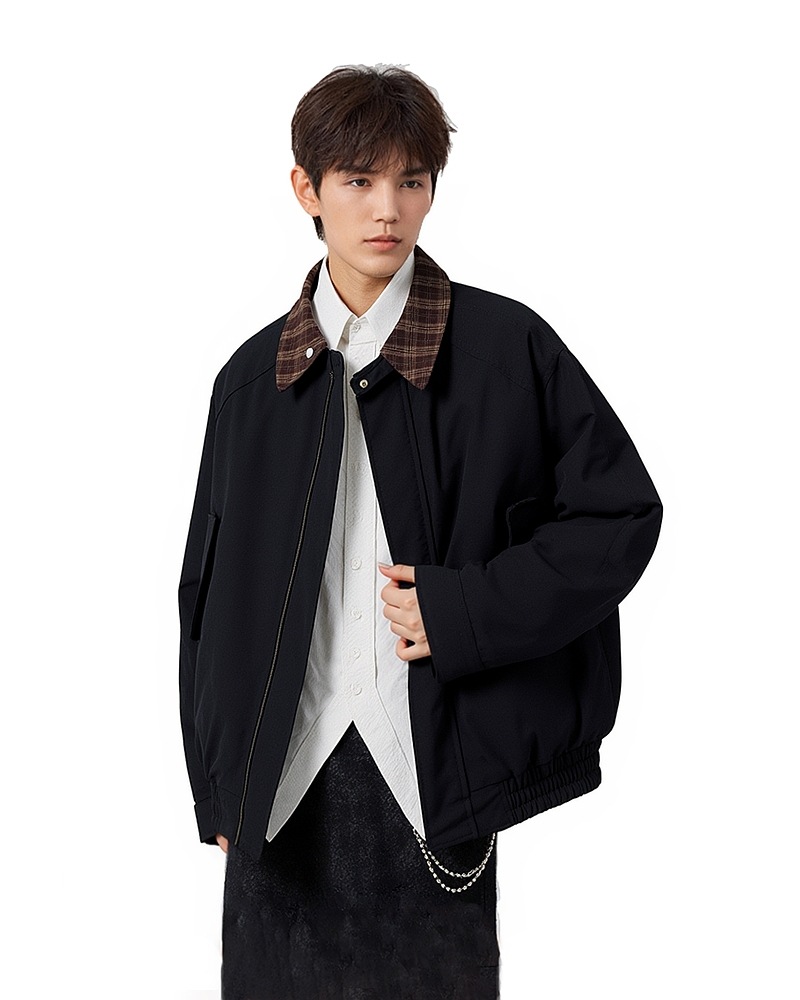 Plaid Patchwork Turn-Down Collar Loose Cotton Coat Men's Workwear Jacket